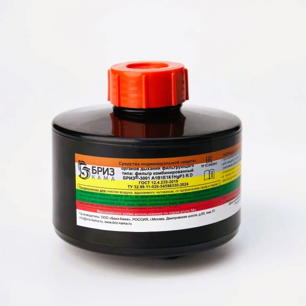Фильтры комбинированные «БРИЗ®-3001» A1B1E1K1HgP3 R D имеют резьбовое соединение (Кр 40х4 ГОСТ 8762-75) и предназначены для применения в составе различных фильтрующих средств индивидуальной защиты органов дыхания производства ООО «Бриз-Кама» (с маской «БРИЗ®-4301М(ППМ)» категории 2, маской «БРИЗ®-4301(ППМ)» категории 3, маской «БРИЗ®-4306(ЭВР)» категории 2 исполнения II, шлем-маской ШМП класс 1 категории 2 и других масок с резъбой Кр 40х4) для очистки вдыхаемого человеком воздуха от химически опасных и вредных токсичных веществ в том числе аварийно-химически опасных веществ ингаляционного действия (АХОВИД), а также различных аэрозолей, которые могут присутствовать в воздушной среде зоны применения данных фильтров в виде паров, газов и аэрозолей.