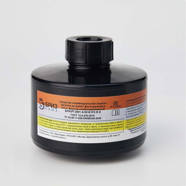 Фильтры комбинированные «БРИЗ®-3001» A1B1E1P3 R D имеют резьбовое соединение (Кр 40х4 ГОСТ 8762-75) и предназначены для применения в составе различных фильтрующих средств индивидуальной защиты органов дыхания производства ООО «Бриз-Кама» (с маской «БРИЗ®-4301М(ППМ)» категории 2, маской «БРИЗ®-4301(ППМ)» категории 3, маской «БРИЗ®-4306(ЭВР)» категории 2 исполнения II, шлем-маской ШМП класс 1 категории 2) для очистки вдыхаемого человеком воздуха от химически опасных и вредных токсичных веществ в том числе аварийно-химически опасных веществ ингаляционного действия (АХОВИД), а также различных аэрозолей, которые могут присутствовать в воздушной среде зоны применения данных фильтров в виде паров, газов и аэрозолей.